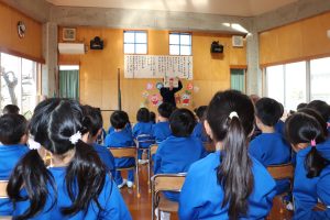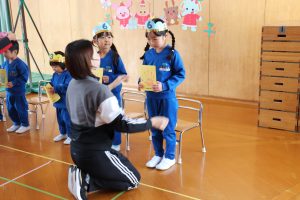 先生からの出し物は、色水を混ぜて「〇〇色を作るにはどうしたらいいか」みんなで考えてやってみる色水シアターを行いました。
